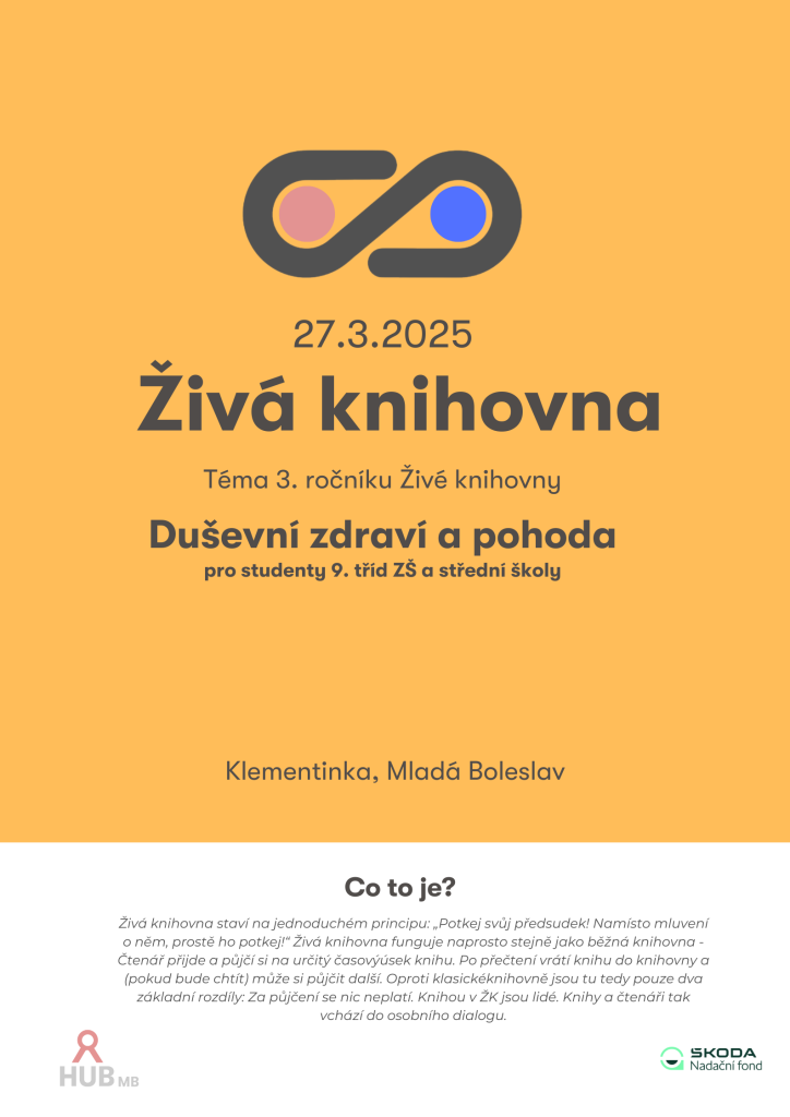 Akce se uskuteční 27.3.2024 od 9:00 – 13:00 v prostorách Klementinky v Mladé Boleslavi, a je vhodná zejména pro 8.a 9. ročníky ZŠ a třídy SŠ. Akce je bezplatná. Tématem tohoto ročníku jsou stereotypy spojené s duševním zdravím, či péčí o něj. Chceme se primárně zaměřit i na detabuizaci psychické podpory ze stran odborníků či zvýšení pochopení duševních nemocí (bulimie, sebepoškozování, závislosti, etc.), a to skrze osobní příběhy.